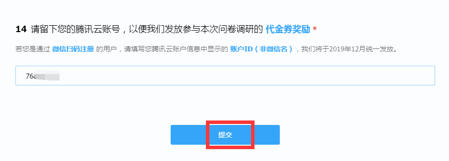 答题结束后看到如下图题目时请注意,账户ID一定要填写正确,这个会影响到我们是否能收到代金券。另外腾讯云也说了此次代金券是送个认真答题的用户的,请不要太过随意填写答案了,以免大家都收到代金券了而你自己没有。