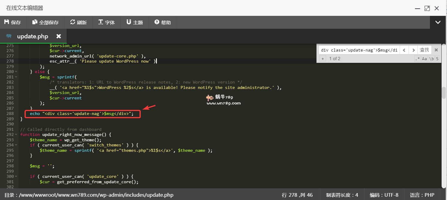 然后在“update.php”文件当中删除掉下面代码。就可以取消掉“自动升级WordPress失败 —— 请再试一次。”提示了。取消后是不是感觉清爽多了。