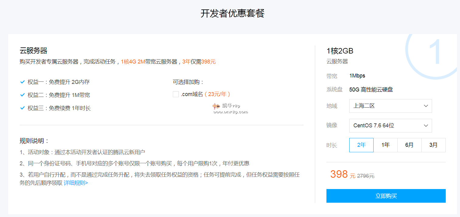 1、首先给大家介绍下开发者专属云服务器配置怎么样。如下图一个可以看得更直观。默认配置是1核2G内存、1Mbps带宽的上海节点云服务器,购买后可以参加免费提升2G内存、免费提升1M带宽、免费续费一年的活动,同时需要需要域名还可以以23元的价格购入一个.com域名。价格相对比较便宜的国内云服务器产品了,等于1核4G内存、2M带宽的腾讯云服务器只需398元/3年,个人建议大家不要选择购买1年、购买2年后想办法免费续费一年更划算。