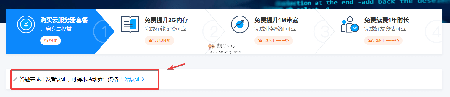 2、腾讯云开发者专属云服务器购买资格认证。首先找到如下图位置,点击红框内的“开始认证”进行答题,一共五道题目。大家通过百度搜答案吧,难度不到,比之前阿里云的30道题目还要*认证的那个活动容易多了。不过需要注意的是必须是新用户才能采用购买“开发者专属云服务器”,老用户即使认证了也没有用。