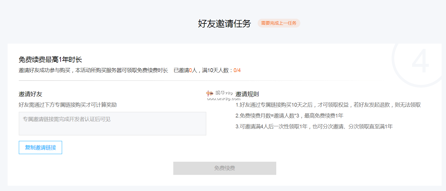 5、最后是免费续费最高1年时长。这个稍微有点难度,需要用自己的链接邀请好友购买,最少购买10天的时间,一共邀请四个人才能领取1年的续费时间。这个大家获取自己的邀请链接可以到一些主机论坛发布,招募参与者。