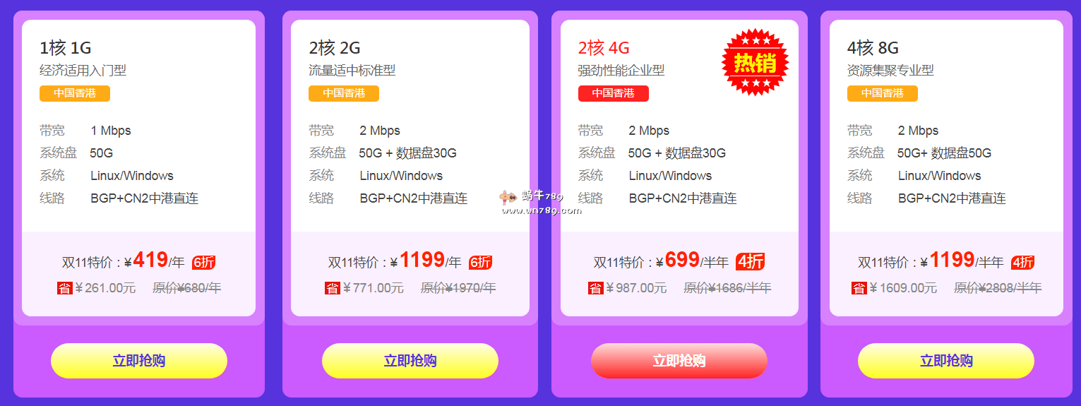 香港云服务器一共四款促销方案:1核1G到4核8G内存,香港BGP多线 + 中港CN2直连线路。基本可以满足大部分个人、企业的各种业务需求。云服务器产品一次性最多可以购入两年,半年付、年付、两年付促销力度都是一样的,属于一次性优惠、续费会恢复原价。