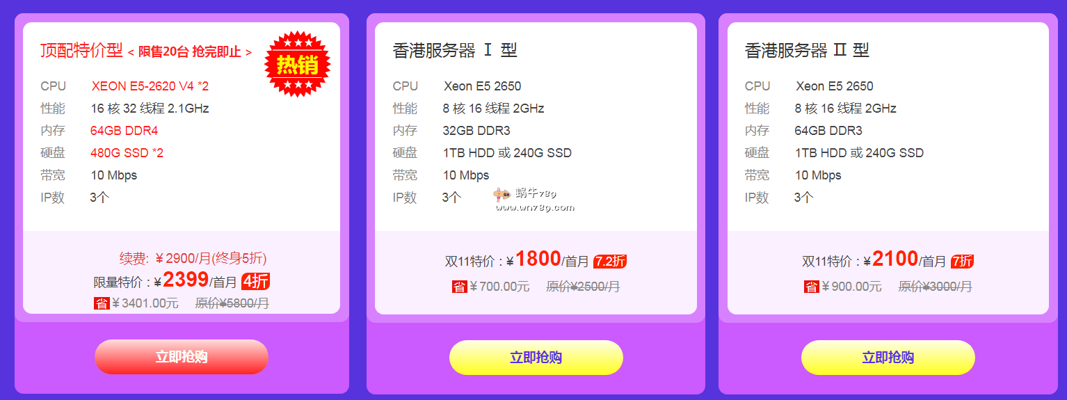 如果觉得上面的云服务器产品带宽、配置不够用,看看下面的独立服务器产品,其中顶配特价力度最大,四折、最高可以购买一年,而且终身可以享受五折续费!其他两款香港服务器也是最多可以优惠的价格购买一年,续费恢复原价。站长个人看着限量20台的顶配方案还是有点心动的!