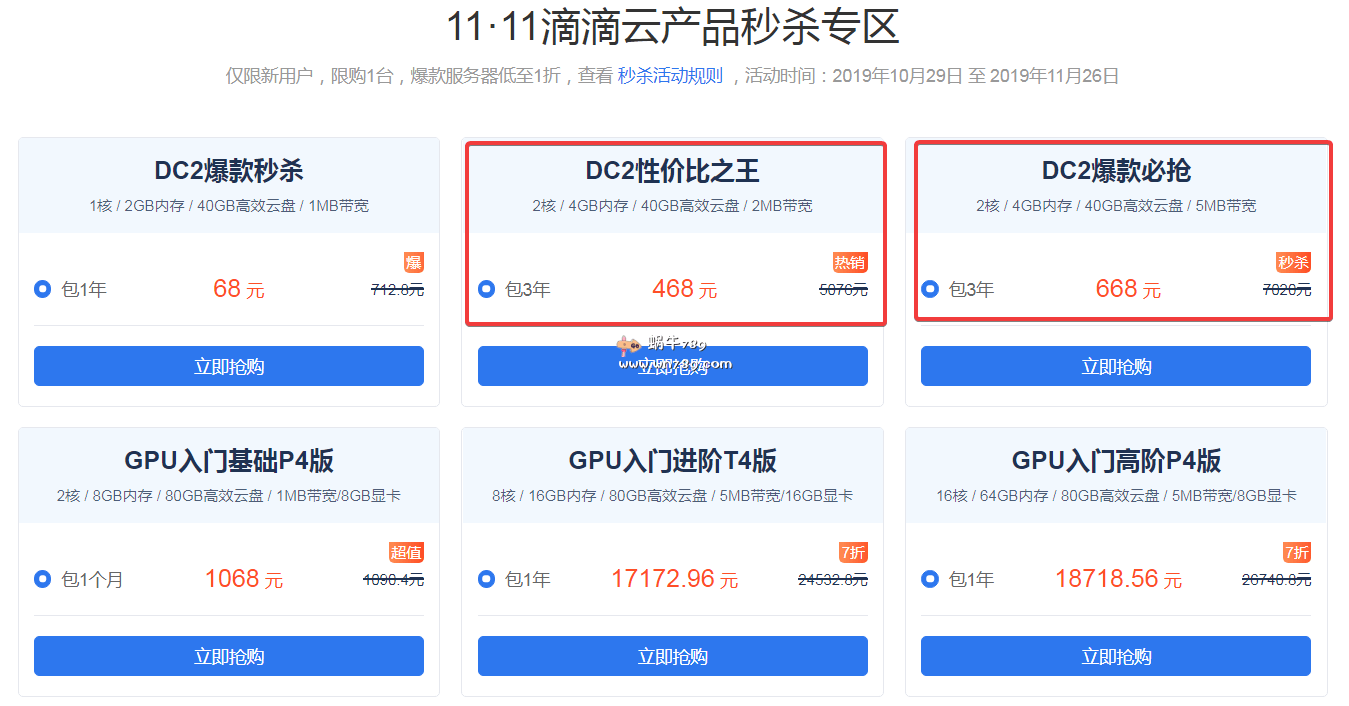 滴滴云2019双11促销:2019年10月29日至2019年11月26日,国内云服务器低至68元/首年起(1核2G、1Mbps),2核4G内存、5Mbps带宽、668元/3年(目前国内大厂家当中最便宜的云服务器方案了),仅限制滴滴云新注册用户参与;老用户也有两款不错的促销方案:2核4G内存、5Mbps带宽、2106元/2年,4核8G内存、5Mbps带宽、3162.24元/2年。滴滴云是北京小桔科技有限公司旗下的云计算服务品牌,与我们手机常用的滴滴出行是同一家公司,并非小作坊,可以放心使用。