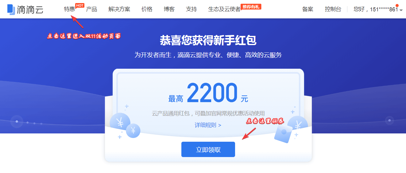 点击上面活动地址后先领取新手红包,然后点击“特惠”进入双11活动页面。