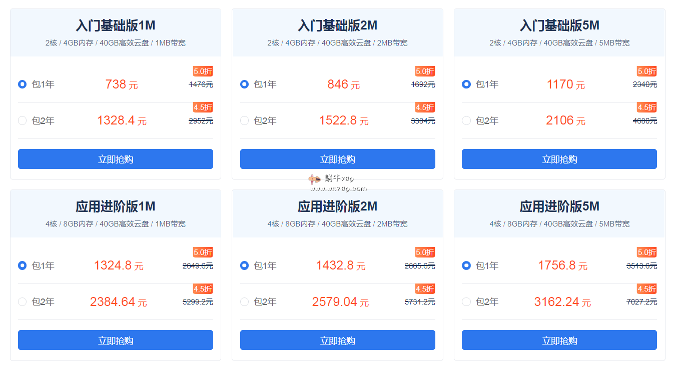新老用户均可以上车购买,最大折扣是4.5折。有2核4G、4核8G两个方案,每款方案最多可以购入5台。建议选择带宽是2Mbps或5Mbps。