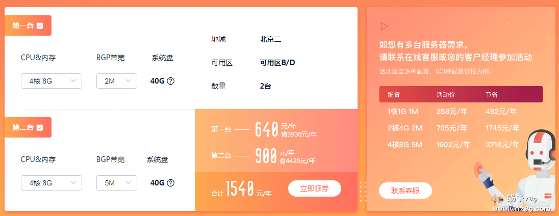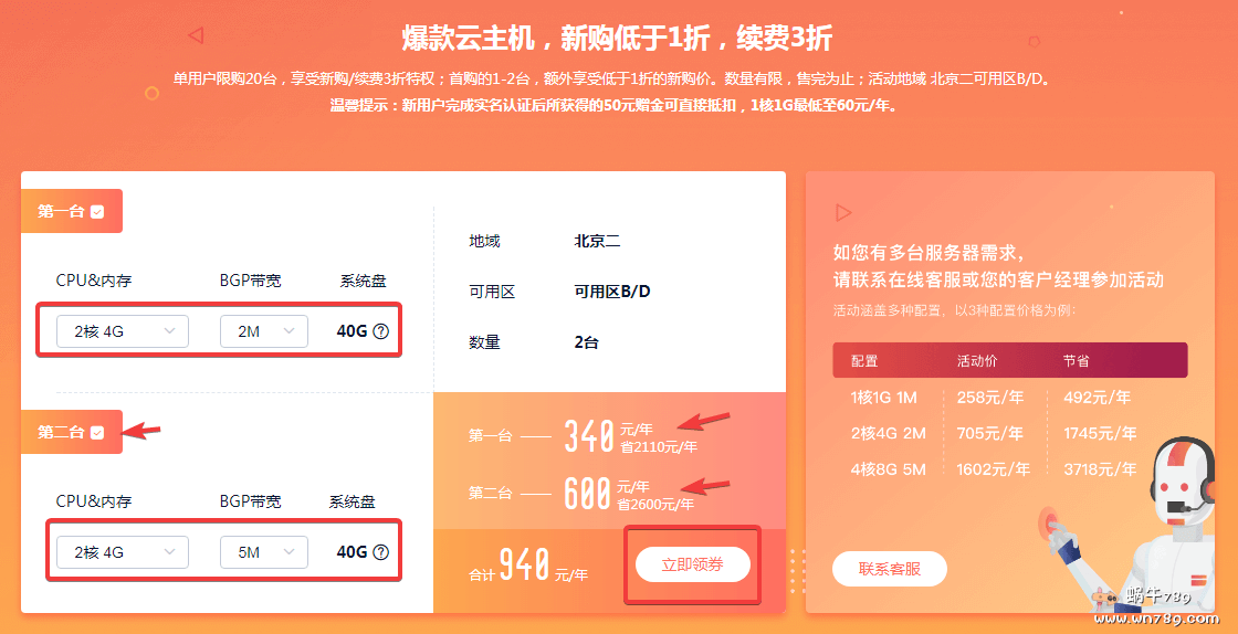 - 2核4G内存、5Mbps带宽:600元/首年,新用户可以再减50、相当于首年只需550元,以后续费是960元/年!