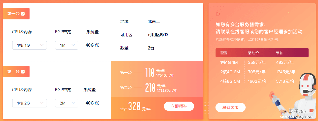 - 2核4G内存、2Mbps带宽:340元/首年,新用户可以再减50、相当于首年只需290元,以后续费是735元/年!
