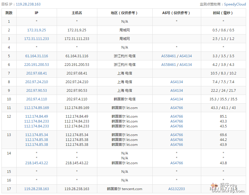 ---------------------------------------------------------------------- 北京电信 traceroute to 220.181.22.1 (220.181.22.1), 30 hops max, 60 byte packets 1 10.165.198.35 0.70 ms * 局域网 2 10.165.198.34 0.61 ms * 局域网 3 10.196.78.13 0.90 ms * 局域网 4 211.53.0.245 8.66 ms AS3786 韩国 首尔 uplus.co.kr 5 210.120.105.213 15.93 ms AS3786 韩国 首尔 uplus.co.kr 6 1.208.106.90 1.70 ms AS3786 韩国 首尔 uplus.co.kr 7 1.213.105.46 25.15 ms AS3786 中国 上海 uplus.co.kr 8 202.97.70.17 30.11 ms * 中国 上海 电信 9 202.97.48.254 36.93 ms AS4134 中国 上海 电信 10 * 11 * 12 220.181.16.18 87.97 ms AS23724 中国 北京 电信 13 218.30.112.141 64.45 ms AS23724 中国 北京 电信 14 220.181.22.1 99.62 ms AS23724 中国 北京 电信 ---------------------------------------------------------------------- 辽宁联通 traceroute to 220.201.8.6 (220.201.8.6), 30 hops max, 60 byte packets 1 10.165.196.251 0.70 ms * 局域网 2 10.165.196.250 0.72 ms * 局域网 3 10.196.78.1 1.00 ms * 局域网 4 211.53.0.185 0.67 ms AS3786 韩国 首尔 uplus.co.kr 5 1.208.107.209 0.89 ms AS3786 韩国 首尔 uplus.co.kr 6 1.208.147.118 2.17 ms AS3786 韩国 首尔 uplus.co.kr 7 219.158.38.117 57.84 ms AS4837 中国 联通 8 219.158.16.81 45.66 ms AS4837 中国 北京 联通 9 219.158.4.169 52.32 ms AS4837 中国 北京 联通 10 219.158.21.82 63.38 ms AS4837 中国 辽宁 沈阳 联通 11 218.61.254.222 54.12 ms AS4837 中国 辽宁 沈阳 联通 12 218.61.254.202 52.84 ms AS4837 中国 辽宁 沈阳 联通 13 218.61.252.150 56.28 ms AS4837 中国 辽宁 沈阳 联通 14 * 15 * 16 * 17 220.201.8.6 54.40 ms AS4837 中国 辽宁 联通 ---------------------------------------------------------------------- 北京移动 traceroute to 221.130.33.1 (221.130.33.1), 30 hops max, 60 byte packets 1 10.165.198.35 0.67 ms * 局域网 2 10.165.198.34 0.54 ms * 局域网 3 10.196.78.5 0.77 ms * 局域网 4 211.53.0.185 0.67 ms AS3786 韩国 首尔 uplus.co.kr 5 1.208.107.209 0.85 ms AS3786 韩国 首尔 uplus.co.kr 6 1.213.104.34 0.89 ms AS3786 韩国 首尔 uplus.co.kr 7 1.208.172.50 41.41 ms AS3786 韩国 首尔 uplus.co.kr 8 223.120.2.53 42.02 ms AS58453 中国 香港 移动 9 * 10 223.120.2.86 46.79 ms AS58453 中国 广东 广州 移动 11 223.120.22.29 76.85 ms AS58453 中国 广东 广州 移动 12 221.183.55.106 80.20 ms AS9808 中国 北京 移动 13 221.183.46.254 80.18 ms AS9808 中国 北京 移动 14 221.176.21.229 78.03 ms AS9808 中国 北京 移动 15 * 16 221.179.159.238 80.33 ms AS56048 中国 北京 移动 17 221.130.33.1 78.57 ms AS56048 中国 北京 移动 ---------------------------------------------------------------------- 杭州电信 traceroute to 60.176.0.1 (60.176.0.1), 30 hops max, 60 byte packets 1 10.165.196.251 0.66 ms * 局域网 2 10.165.196.250 0.61 ms * 局域网 3 10.196.78.9 0.94 ms * 局域网 4 211.53.0.245 0.97 ms AS3786 韩国 首尔 uplus.co.kr 5 1.208.107.205 5.28 ms AS3786 韩国 首尔 uplus.co.kr 6 61.43.235.22 1.52 ms AS3786 韩国 首尔 uplus.co.kr 7 * 8 202.97.12.53 74.35 ms AS4134 中国 北京 电信 9 * 10 202.97.68.162 79.85 ms * 中国 浙江 杭州 电信 11 * 12 1.0.176.60.broad.hz.zj.dynamic.163data.com.cn (60.176.0.1) 82.45 ms AS4134 中国 浙江 杭州 电信 ---------------------------------------------------------------------- 宁波联通 traceroute to 60.12.17.1 (60.12.17.1), 30 hops max, 60 byte packets 1 10.165.196.251 0.70 ms * 局域网 2 10.165.196.250 2.68 ms * 局域网 3 10.196.78.9 0.95 ms * 局域网 4 211.53.0.245 0.73 ms AS3786 韩国 首尔 uplus.co.kr 5 1.208.107.217 0.87 ms AS3786 韩国 首尔 uplus.co.kr 6 1.213.104.34 0.89 ms AS3786 韩国 首尔 uplus.co.kr 7 219.158.43.225 25.67 ms AS4837 中国 联通 8 219.158.19.78 28.53 ms AS4837 中国 上海 联通 9 219.158.19.81 28.91 ms AS4837 中国 上海 联通 10 219.158.115.146 37.86 ms AS4837 中国 浙江 杭州 联通 11 221.12.35.126 34.92 ms AS4837 中国 浙江 宁波 联通 12 * 13 60.12.17.1 32.83 ms AS4837 中国 浙江 宁波 联通 ---------------------------------------------------------------------- 杭州移动 traceroute to 211.140.0.2 (211.140.0.2), 30 hops max, 60 byte packets 1 10.165.198.35 0.74 ms * 局域网 2 10.165.198.34 0.58 ms * 局域网 3 10.196.78.13 0.98 ms * 局域网 4 211.53.0.245 0.80 ms AS3786 韩国 首尔 uplus.co.kr 5 210.120.105.213 12.81 ms AS3786 韩国 首尔 uplus.co.kr 6 1.208.145.110 5.38 ms AS3786 韩国 首尔 uplus.co.kr 7 1.208.172.50 42.10 ms AS3786 韩国 首尔 uplus.co.kr 8 223.120.2.53 42.99 ms AS58453 中国 香港 移动 9 223.120.2.6 47.74 ms AS58453 中国 广东 广州 移动 10 223.120.22.5 75.62 ms AS58453 中国 广东 广州 移动 11 221.183.55.30 76.10 ms AS9808 中国 上海 移动 12 221.183.25.189 76.01 ms AS9808 中国 上海 移动 13 221.176.17.177 75.60 ms AS9808 中国 上海 移动 14 221.176.22.122 98.94 ms AS9808 中国 浙江 杭州 移动 15 211.140.0.2 94.49 ms AS56041 中国 浙江 杭州 移动 ---------------------------------------------------------------------- 贵阳电信 traceroute to 58.42.224.1 (58.42.224.1), 30 hops max, 60 byte packets 1 10.165.196.251 0.60 ms * 局域网 2 10.165.196.250 0.74 ms * 局域网 3 10.196.78.9 0.96 ms * 局域网 4 211.53.0.245 0.77 ms AS3786 韩国 首尔 uplus.co.kr 5 1.208.107.217 48.26 ms AS3786 韩国 首尔 uplus.co.kr 6 211.53.88.22 10.55 ms AS3786 韩国 首尔 uplus.co.kr 7 211.40.6.110 72.63 ms AS3786 中国 北京 uplus.co.kr 8 202.97.12.61 67.53 ms AS4134 中国 北京 电信 9 202.97.34.157 80.86 ms AS4134 中国 北京 电信 10 * 11 202.97.69.126 139.33 ms * 中国 贵州 贵阳 电信 12 61.189.177.86 127.40 ms AS4134 中国 贵州 贵阳 电信 13 59.51.187.145 135.80 ms AS4134 中国 贵州 贵阳 电信 14 * 15 * 16 * 17 * 18 * 19 * 20 * 21 * 22 * 23 * 24 58.42.224.1 133.83 ms AS4134 中国 贵州 贵阳 电信 ---------------------------------------------------------------------- 贵阳联通 traceroute to 58.16.28.1 (58.16.28.