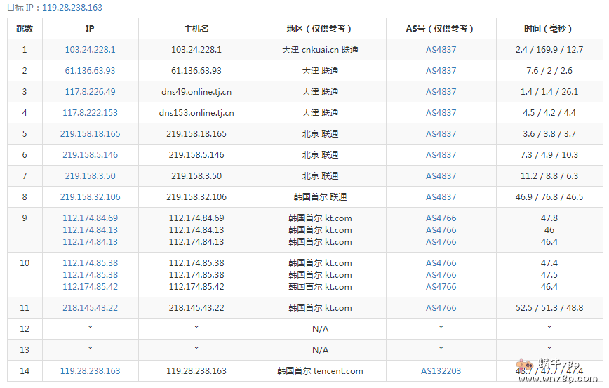4、电信、联通、移动访问腾讯云韩国云服务器去程路由情况测试。去程路由相对来说电信、联通是非常不错的,KT直连韩国,移动稍差、但是也不错、走香港出、LG线路到韩国。