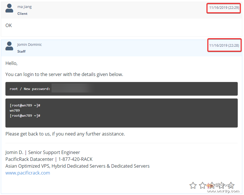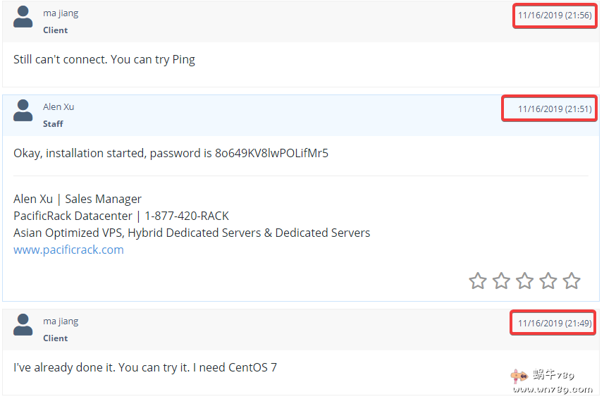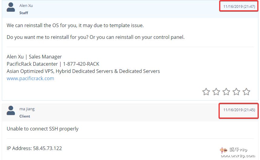 站长之前开通了一款vps,由于之前dd系统的原因导致重装系统后都无法通过root连接上ssh了,而且ip也无法ping通,于是今天下午站长就通过工单联系技术部门解决此问题。下面是工单沟通的完整截图。从下向上看,基本都是几分钟就回复了。当然这个只是站长个人体验遇到的情况,不代表全部。