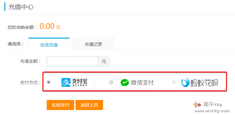 支持支付宝、微信、蚂蚁花呗进行充值!