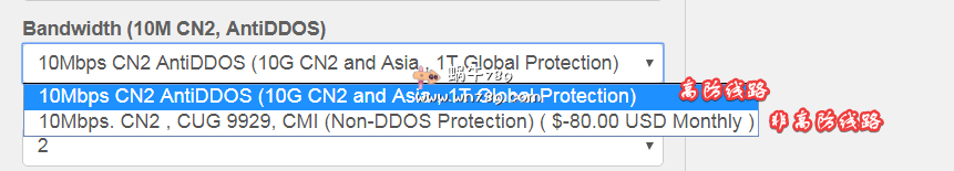 注意跟进自己需要选择高防或者非高防线路。默认选择的是高防线路,如果不需要高防请选择减80美元的线路:cn2、联通9929、移动cmi直连。