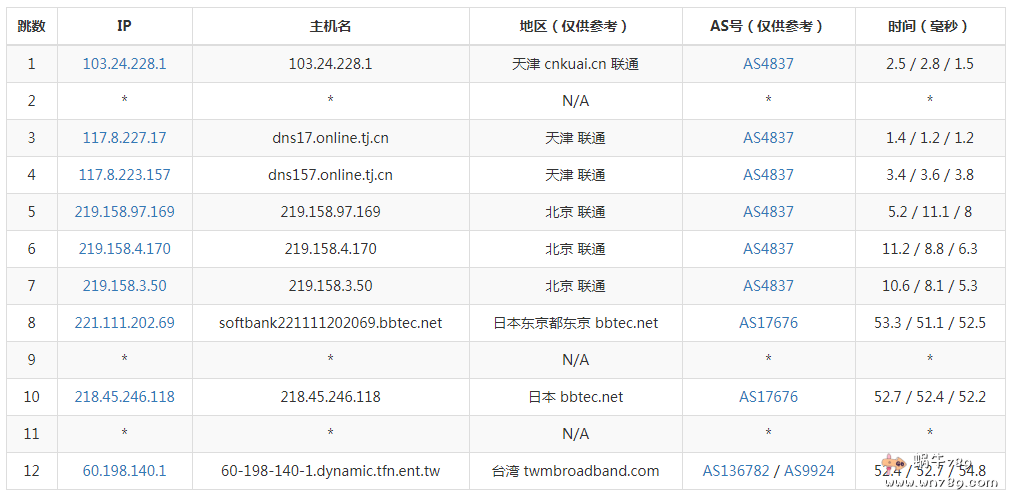 | 联通线路 | 11 | 浙江杭州(联通) 42.8 毫秒 | 广东茂名(联通) 94.4 毫秒 | 60.5 毫秒 |