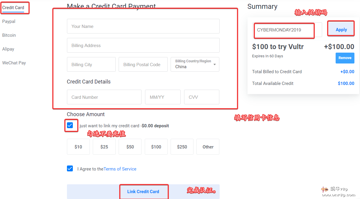 关于账号注册问题,站长也不多说了,很简单,大家注册即可。本次活动赠送的100美元大家可以完全免费撸,不需要充值,但前提是需要绑定验证信用卡。和以前的一贯促销活动一样,不支持支付宝、微信支付的用户撸。