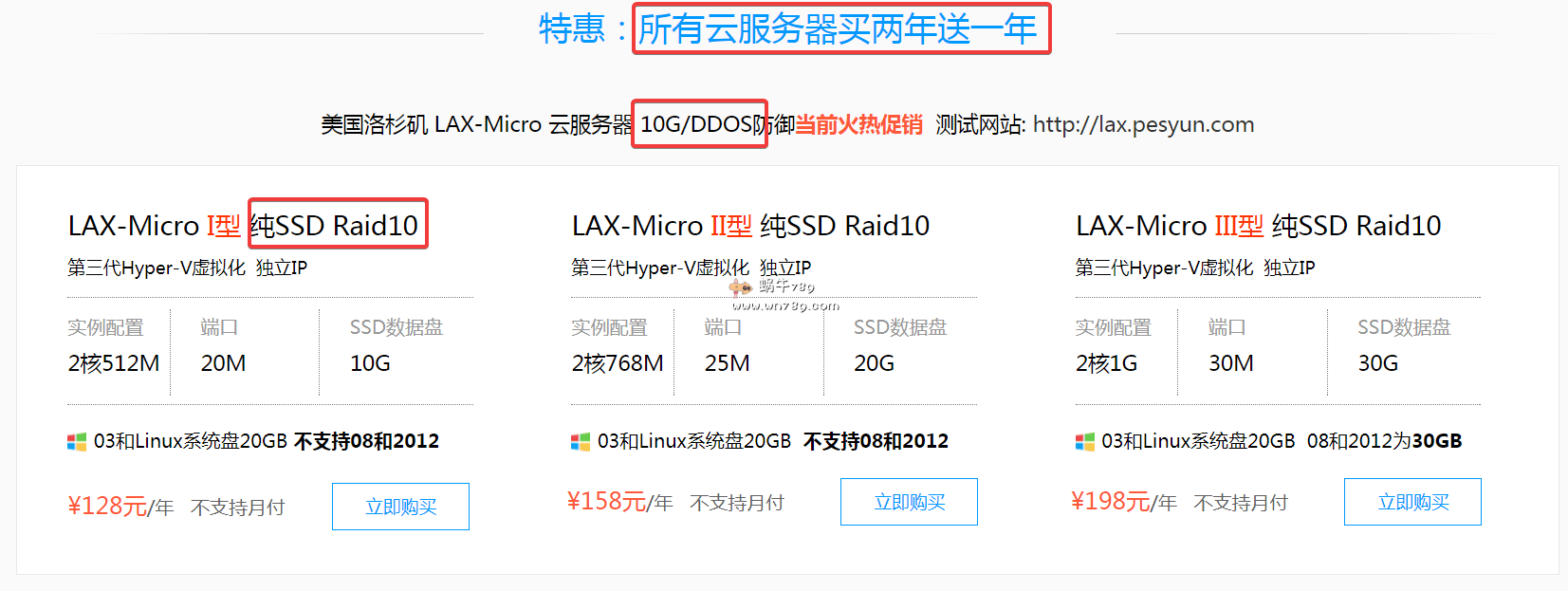 下面是此次限量的特价美国云服务器促销方案,亮点站长都用红框标注了。买2年送1年,纯SSD硬盘,默认10Gbps DDoS防御。