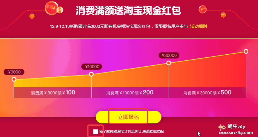 活动期间消费满一定的额度可以活动淘宝现金红包,可用于淘宝天猫店实物消费。一共有100、200、500的三种额度领取。参与的请仔细看清楚现金红包“活动规则”,里面有详细的领取时间、消费时间、消费限制!!!