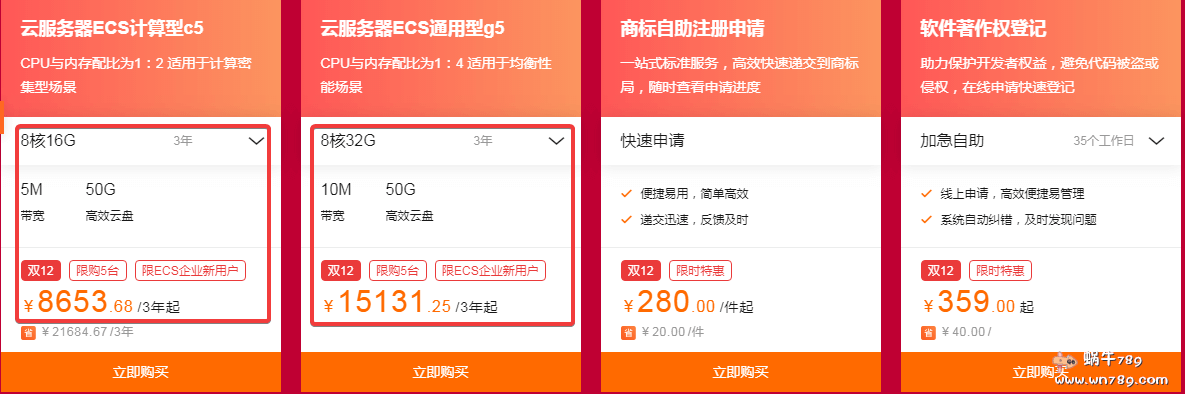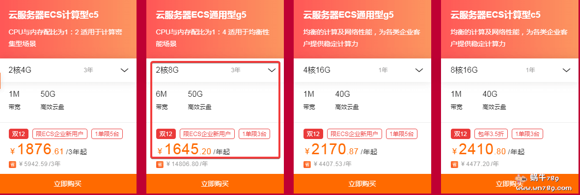 上面两个活动都参与了,接下来就看看新用户的云服务器促销方案了。站长文章开头说了,此次阿里云服务器双12促销活动对企业认证的新用户力度是非常大的。5Mbps带宽以上促销云服务器方案基本都是企业认证用户参与。最低都是2核8G内存起步,5M带宽1629元/3年起。另外还有4核8G、8核16、16核32的高配云服务器可以选择。有需要的就尽情撸吧,并且可以一次性以折扣价格购入多台。