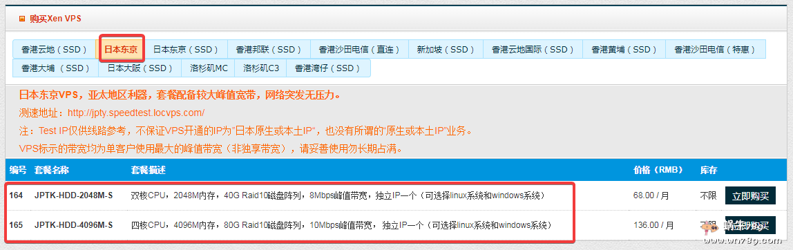 点击上面的LOCVPS官方网站注册一个账号后并登陆用户中心,如下图找到XEN架构VPS并选择“日本东京(SSD)”就是促销的vps服务器产品。最低配置2核2G内存起步,SSD硬盘,8Mbps带宽不限流量折后只需48.75元/月(月付到期后续费也是这个折扣价格),性价比很高了。