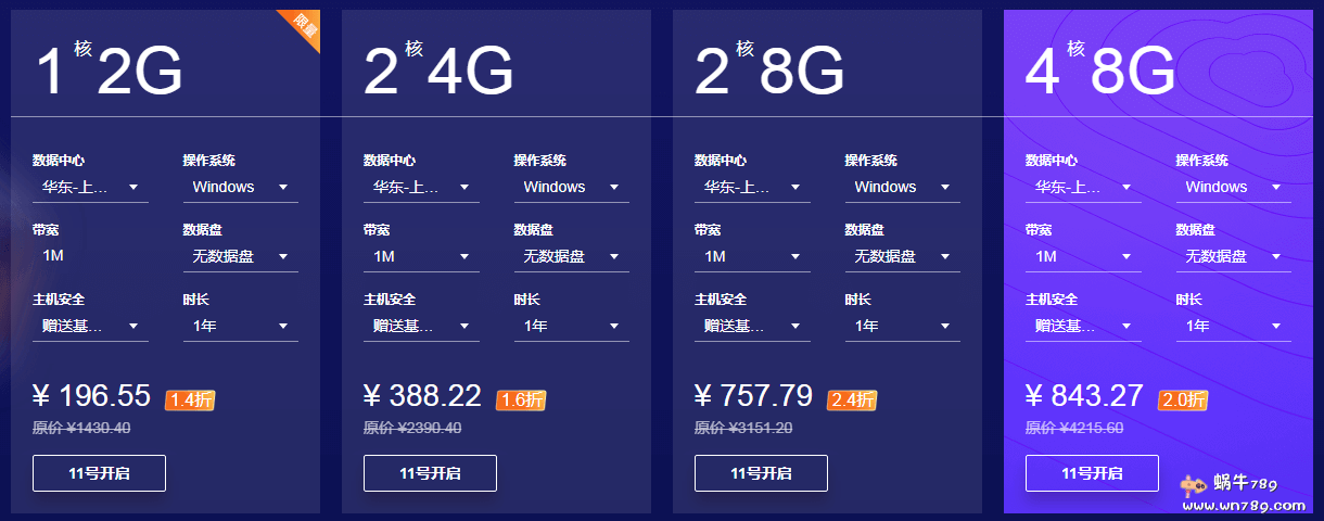 促销配置及价格统计如下。一共1核2G、2核4G、2核8G、4核8G四款常用配置,可满足绝大多数个人及企业用户的需求。