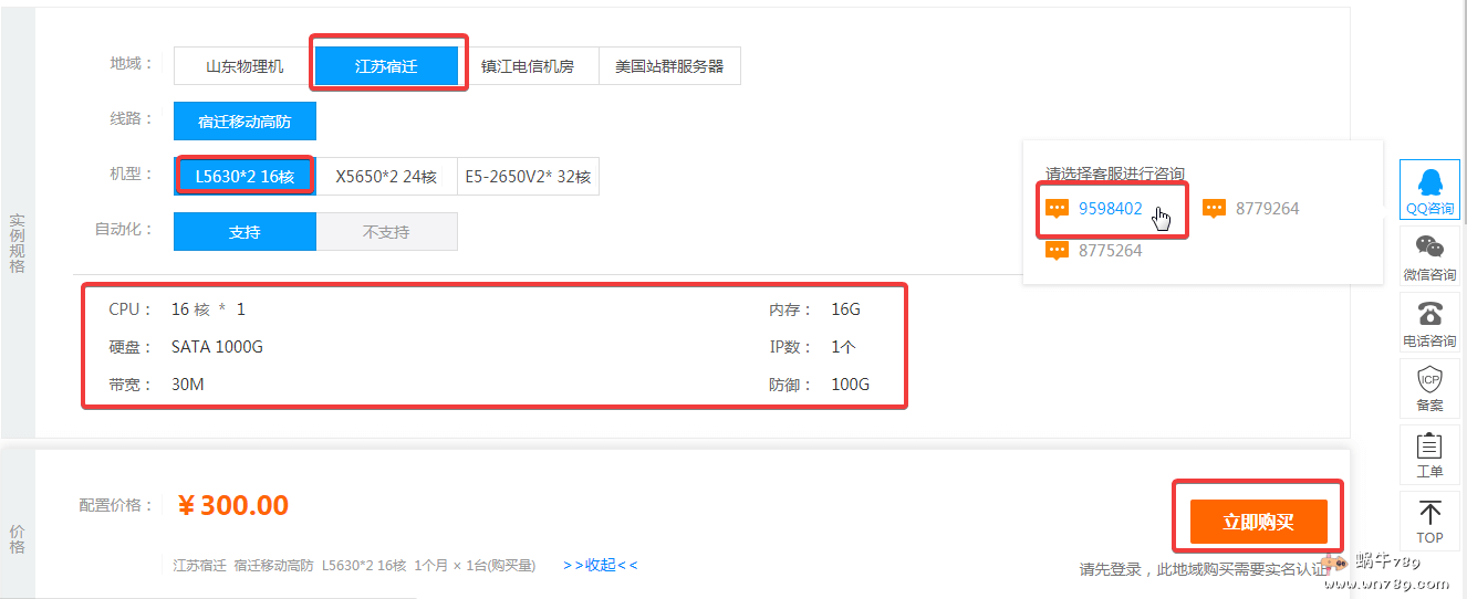 然后直接入下图红框标注选择“江苏宿迁”-“L5630*2”,目前官方销售的价格是300元/月。