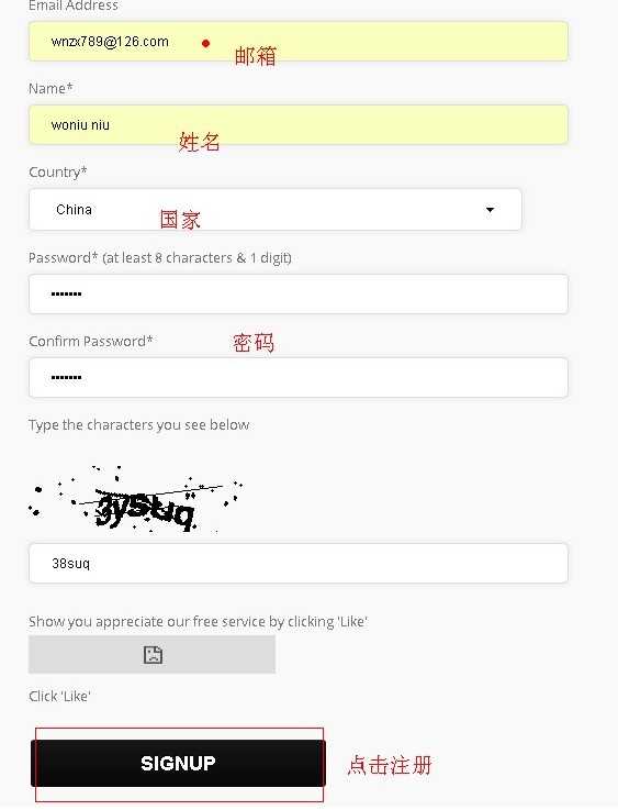 1、打开申请地址,然后填写注册信息。Youhosting分销空间的注册页面一般如下图,主要填写邮箱、姓名、国家、密码及验证码,但是偶尔有些会稍微多点,如地址、邮编、城市、公司名称等。填写好后,一般点击“SIGNUP”注册。