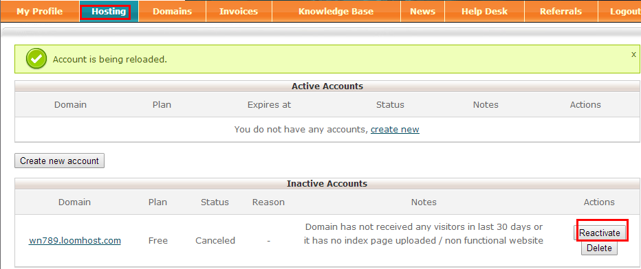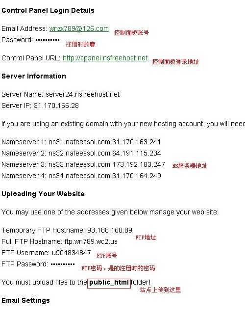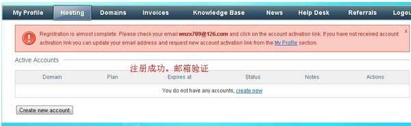 7、点击”Create”创建后,就进入到了主机自动开通页面。这个时候我们只要稍微等待几秒。一般只需稍等片刻,你再按F5刷新这个页面,我们开通的主机就显示出来了。同时我们邮箱也有可能收到了相关空间的信息,如控制面板地址、账号、密码,FTP信息,NS服务器地址等。有可能你的邮箱邮件信息如下。这个请保管好,防止以后自己忘记了某些数据。也有些没有收到此邮件,没有收到的直接跳过。