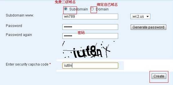 6、点击创建之后,进入了域名选择,一般都有2种:a.使用免费二级域名;b.绑定自己的域名(如果你要绑定自己的域名,建议你在这一步完成。你在这里选择了绑定自己域名,空间开通会你只要到自己的域名控制面板A记录解析到空间IP就可以了。还有很多YouHosting分销空间只能在这个步骤绑定自己的域名,否则以后无法绑定自己域名。)除此之外,还要注意的是密码,第一步在创建账号是填写了密码,现在在创建主机又填写密码,请注意,此处的密码是你创建的这个虚拟主机的管理密码,如FTP账号密码,数据库密码,控制面板管理密码等。如果实在怕混淆,建议所有密码设置为一致。填写好后点击”Create”创建。
