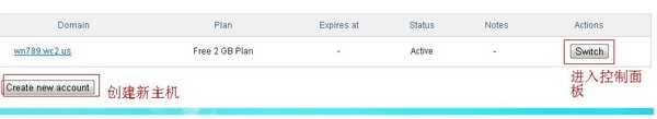 8、按F5刷新页面后,显示如下图,表示主机开通成功。此时我们点击“Switch”进入空间的控制面板,当然如果你以后还想再开通一个,你点击“Create new account”创建新的主机即可。创建步骤都和上面一样。9、数据库创建。我们点击“Switch”后进入控制面板管理后,可以查看到如下图位置,点击“MySQLDatabases”进入到数据库创建页面。