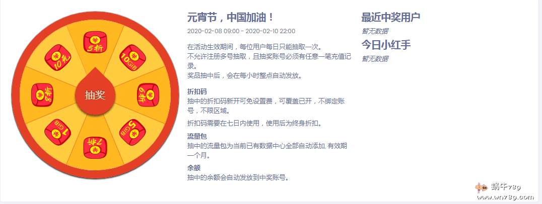 DogYun幸运大转盘就是抽奖活动,此次元宵节DogYun幸运大转盘抽奖活动可以抽出折扣码、流量包、账户余额等。活动期间每个账户每天可以抽取一次,但是不能重复注册账号抽奖,并且参与抽奖的用户必须有一次充值记录,中奖率100%。