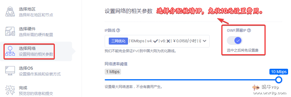 选购**IP免设置费。下单过程当中我们在选择网络时可以勾选“GWF屏蔽IP”,这样我们购入的VPS可以直接分配**IP,同时还免网络设置费用,这样可以在节约成本的基础上满足一些仅面向国外业务的用户。