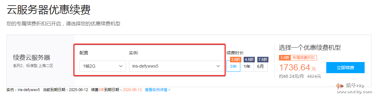 如下图站长是可以参与的,站长手上有一款腾讯云1核2G内存的配置,2Mbps带宽,选择一次性续费3年的话可以享受3.6折的优惠,仅需要1736.64元/3年!!!大家选择这个续费周期一定考虑清楚了,每个用户只能为一台云服务器续费一次,所以年限根据自己需要选择,个人建议一般是一次性三年!!!