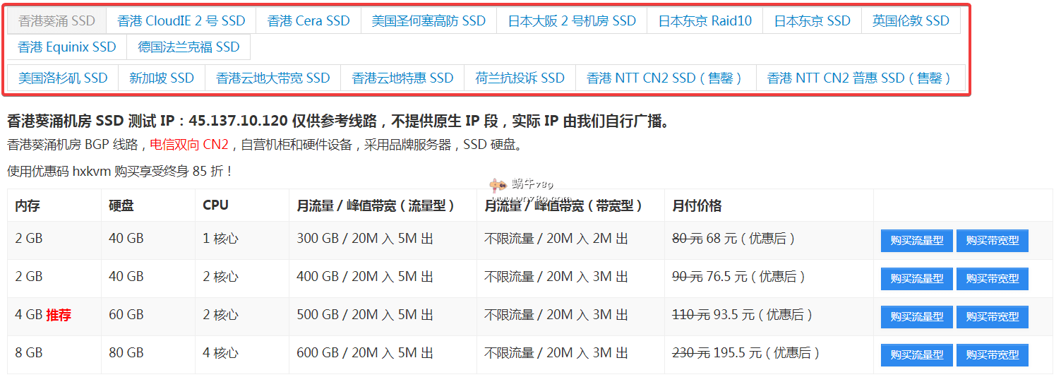 | 香港NTT | 1核 | 2048M | 20G SSD | 5M/300G | 2M/不限 | KVM | 60.0元 | 点击购买 |