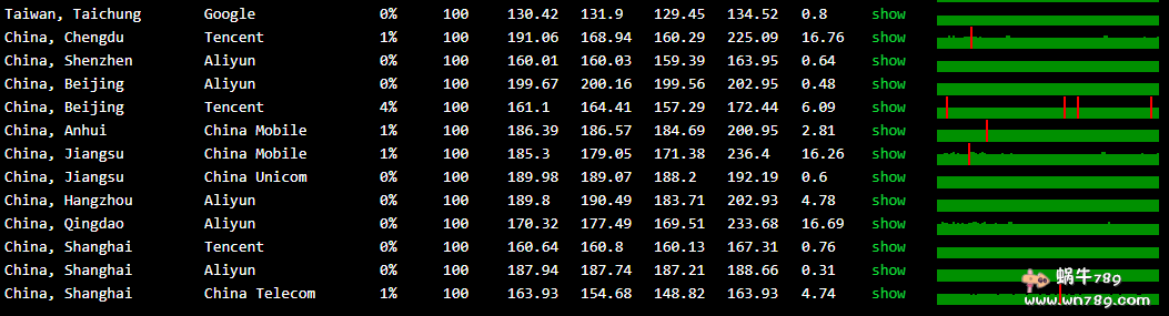 0. CN 112.30.130.0 Loss% Snt Last Avg Best Wrst StDev AS Name PTR 1. ??? 100.0 20 0.0 0.0 0.0 0.0 0.0 - 2. ??? 100.0 20 0.0 0.0 0.0 0.0 0.0 - 3. CN 112.29.129.41 0.0% 20 0.6 1.1 0.6 3.8 0.7 9808 CN CMNET-GD 112.29.129.41 4. CN 112.29.129.9 0.0% 20 2.4 2.5 1.9 4.5 0.6 9808 CN CMNET-GD 112.29.129.9 5. CN 221.183.12.177 0.0% 20 1.2 8.0 1.0 76.1 18.3 9808 CN CMNET-GD 221.183.12.177 6. CN 221.176.18.2 0.0% 20 29.5 30.0 20.2 37.1 5.4 9808 CN CMNET-GD 221.176.18.2 7. CN 221.176.22.22 0.0% 20 19.2 20.1 14.6 38.2 4.9 9808 CN CMNET-GD 221.176.22.22 8. CN 219.158.45.169 0.0% 20 21.2 20.8 16.3 23.5 2.4 4837 CN CHINA169-BACKBONE 219.158.45.169 9. CN 219.158.113.197 0.0% 20 26.2 20.7 15.3 26.2 2.9 4837 CN CHINA169-BACKBONE 219.158.113.197 10. CN 219.158.6.234 70.0% 20 43.4 43.9 41.7 48.8 2.6 4837 CN CHINA169-BACKBONE 219.158.6.234 11. CN 219.158.24.126 0.0% 20 45.8 45.7 38.7 50.1 3.3 4837 CN CHINA169-BACKBONE 219.158.24.126 12. CN 219.158.24.134 0.0% 20 45.0 44.8 37.6 49.6 3.4 4837 CN CHINA169-BACKBONE 219.158.24.134 13. US 199.102.95.14 0.0% 20 193.3 194.5 188.4 218.4 6.1 19174 US AS19174 199.102.95.14 14. US 207.254.184.102 0.0% 20 186.1 185.7 180.0 196.6 3.4 19174 US AS19174 207.254.184.102 15. US 208.64.231.5 5.0% 20 217.6 190.4 180.3 217.6 9.8 35916 US MULTA-ASN1 be3-1.cr3.lax.multacom.com 16. US 173.82.175.33 5.0% 20 187.1 184.5 179.5 188.1 2.6 35916 US MULTA-ASN1 173.82.175.33