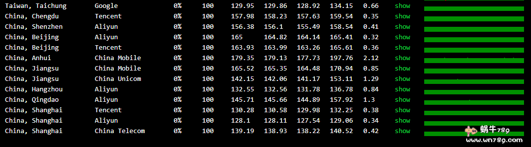 2、HoRain美国安畅CN2 GIA VPS国内节点丢包及抖动测试。从测试结果来看无一丢包,绿色长条波动非常小。