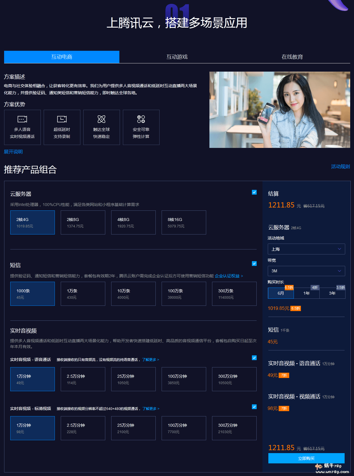 腾讯云服务器x云通信联合大促活动当中推荐组合有互动电商、互动游戏、在线教育等应用场景。企业用户根据自己项目需求自由搭配选购即可。