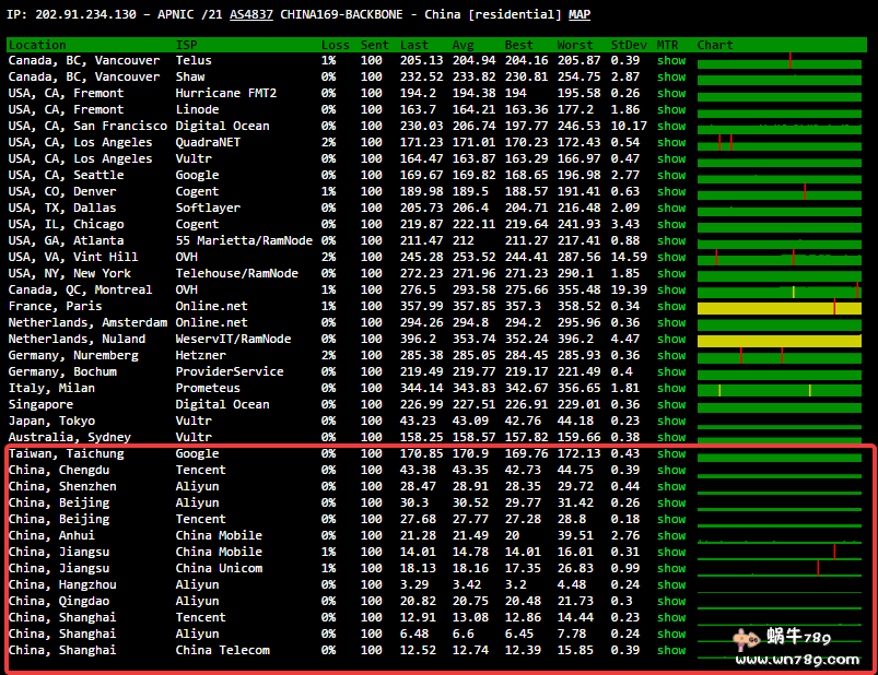 2、stsdust杭州联通大带宽nat vps国际海外节点丢包及稳定性测试。稳定性是非常不错的,仅部分节点有少量丢包。
