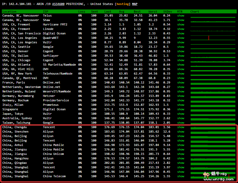 0. CN 222.186.161.0 Loss% Snt Last Avg Best Wrst StDev AS Name PTR 1 CN 222.186.161.1 0.0% 20 4.1 3.1 2.5 4.5 0.5 23650 CN CHINANET-JS 222.186.161.1 2 10.10.10.1 0.0% 20 52.6 24.8 3.1 69.0 20.9 - 3 ??? 100.0 20 0.0 0.0 0.0 0.0 0.0 - 4 CN 218.3.7.253 0.0% 20 1.0 1.1 0.8 1.5 0.0 4134 CN CHINANET-BACKBONE 218.3.7.253 5 CN 58.217.45.233 0.0% 20 3.1 3.2 3.0 3.4 0.0 4134 CN CHINANET-BACKBONE 58.217.45.233 6 CN 61.160.130.161 0.0% 20 2.8 5.0 2.8 15.3 2.6 4134 CN CHINANET-BACKBONE 61.160.130.161 7 CN 202.97.92.1 0.0% 20 10.9 8.8 6.9 10.9 1.1 4134 CN CHINANET-BACKBONE 202.97.92.1 8 CN 202.97.24.150 0.0% 20 10.3 9.3 7.3 11.0 1.0 4134 CN CHINANET-BACKBONE 202.97.24.150 9 CN 202.97.51.161 0.0% 20 12.9 11.9 7.6 15.2 2.4 4134 CN CHINANET-BACKBONE 202.97.51.161 10 CN 202.97.27.210 0.0% 20 169.8 171.6 168.7 174.9 1.9 4134 CN CHINANET-BACKBONE 202.97.27.210 11 CN 202.97.62.6 0.0% 20 156.4 157.8 153.5 161.2 2.0 4134 CN CHINANET-BACKBONE 202.97.62.6 12 CN 218.30.53.186 0.0% 20 160.5 160.7 160.3 161.0 0.0 4134 CN CHINANET-BACKBONE 218.30.53.186 13 10.255.255.240 0.0% 20 154.3 155.5 154.1 178.6 5.4 - 14 10.255.254.43 0.0% 20 147.2 147.2 147.1 147.4 0.0 - 15 US 142.4.104.181 0.0% 20 146.5 146.5 146.4 146.6 0.0 54600 US PEGTECHINC 142.4.104.181