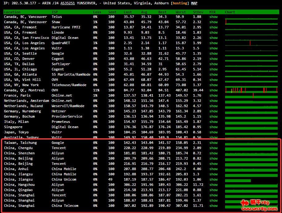 ---------------------------------------------------------------------- 北京电信 traceroute to 220.181.22.1 (220.181.22.1), 30 hops max, 60 byte packets 1 23.133.1.254 4.39 ms AS35251 ANYDNS.ZONE hostus.us 2 * 3 * 4 212.95.128.1 0.86 ms AS22769 美国 加利福尼亚州 洛杉矶 nlidc.com 5 218.30.49.165 0.86 ms AS4134 美国 电信 6 59.43.189.37 184.45 ms * 中国 上海 电信 7 59.43.247.141 211.17 ms * 中国 北京 电信 8 59.43.188.73 208.53 ms * 中国 北京 电信 9 59.43.132.9 206.25 ms * 中国 北京 电信 10 * 11 * 12 * 13 220.181.22.1 206.47 ms AS23724 中国 北京 电信 ---------------------------------------------------------------------- 北京移动 traceroute to 221.130.33.1 (221.130.33.1), 30 hops max, 60 byte packets 1 23.133.1.254 1.63 ms AS35251 ANYDNS.ZONE hostus.us 2 * 3 * 4 212.95.128.1 0.72 ms AS22769 美国 加利福尼亚州 洛杉矶 nlidc.com 5 218.30.49.165 0.92 ms AS4134 美国 电信 6 59.43.189.37 186.21 ms * 中国 上海 电信 7 59.43.246.253 182.89 ms * 中国 上海 电信 8 59.43.138.49 188.65 ms * 中国 上海 电信 9 59.43.80.82 184.78 ms * 中国 上海 电信 10 202.97.48.190 204.39 ms AS4134 中国 陕西 西安 电信 11 202.97.65.109 227.87 ms * 中国 北京 电信 12 202.97.88.226 215.63 ms AS4134 中国 北京 电信 13 221.183.66.233 208.13 ms AS9808 中国 北京 移动 14 221.183.9.197 212.94 ms AS9808 中国 北京 移动 15 * 16 * 17 221.130.33.1 215.43 ms AS56048 中国 北京 移动 ---------------------------------------------------------------------- 杭州电信 traceroute to 60.176.0.1 (60.176.0.1), 30 hops max, 60 byte packets 1 23.133.1.254 1.49 ms AS35251 ANYDNS.ZONE hostus.us 2 * 3 * 4 212.95.128.1 0.59 ms AS22769 美国 加利福尼亚州 洛杉矶 nlidc.com 5 218.30.49.165 1.26 ms AS4134 美国 电信 6 59.43.189.37 184.44 ms * 中国 上海 电信 7 59.43.187.85 184.99 ms * 中国 上海 电信 8 59.43.138.61 183.92 ms * 中国 上海 电信 9 59.43.47.90 193.51 ms * 中国 浙江 杭州 电信 10 * 11 1.0.176.60.broad.hz.zj.dynamic.163data.com.cn (60.176.0.1) 191.47 ms AS4134 中国 浙江 杭州 电信 ---------------------------------------------------------------------- 宁波联通 traceroute to 60.12.17.1 (60.12.17.1), 30 hops max, 60 byte packets 1 23.133.1.254 1.50 ms AS35251 ANYDNS.ZONE hostus.us 2 * 3 * 4 212.95.128.1 0.67 ms AS22769 美国 加利福尼亚州 洛杉矶 nlidc.com 5 218.30.49.165 0.89 ms AS4134 美国 电信 6 59.43.189.37 184.37 ms * 中国 上海 电信 7 * 8 59.43.130.213 188.17 ms * 中国 上海 电信 9 * 10 219.158.113.197 167.09 ms AS4837 中国 上海 联通 11 219.158.106.122 198.83 ms AS4837 中国 浙江 杭州 联通 12 * 13 221.12.33.37 174.72 ms AS4837 中国 浙江 宁波 联通 14 60.12.17.1 193.19 ms AS4837 中国 浙江 宁波 联通 ---------------------------------------------------------------------- 杭州移动 traceroute to 211.140.0.2 (211.140.0.2), 30 hops max, 60 byte packets 1 23.133.1.254 1.34 ms AS35251 ANYDNS.ZONE hostus.us 2 * 3 * 4 212.95.128.5 0.79 ms AS22769 美国 加利福尼亚州 洛杉矶 nlidc.com 5 218.30.49.165 0.91 ms AS4134 美国 电信 6 59.43.189.37 184.44 ms * 中国 上海 电信 7 59.43.187.69 185.03 ms * 中国 上海 电信 8 59.43.138.49 184.99 ms * 中国 上海 电信 9 59.43.80.98 185.13 ms * 中国 上海 电信 10 202.97.92.34 191.17 ms AS4134 中国 浙江 杭州 电信 11 * 12 * 13 221.183.25.145 185.57 ms AS9808 中国 浙江 杭州 移动 14 211.140.0.2 211.41 ms AS56041 中国 浙江 杭州 移动 ---------------------------------------------------------------------- 贵阳电信 traceroute to 58.42.224.1 (58.42.224.1), 30 hops max, 60 byte packets 1 23.133.1.254 1.02 ms AS35251 ANYDNS.ZONE hostus.us 2 * 3 * 4 212.95.128.5 0.72 ms AS22769 美国 加利福尼亚州 洛杉矶 nlidc.com 5 218.30.49.165 0.82 ms AS4134 美国 电信 6 59.43.184.117 166.77 ms * 中国 电信 7 * 8 59.43.130.125 146.86 ms * 中国 广东 广州 电信 9 59.43.18.245 149.89 ms * 中国 广东 广州 电信 10 59.43.146.222 169.98 ms * 中国 贵州 电信 11 * 12 59.51.187.141 201.94 ms AS4134 中国 贵州 贵阳 电信 13 58.42.224.1 202.04 ms AS4134 中国 贵州 贵阳 电信 ---------------------------------------------------------------------- 贵阳联通 traceroute to 58.16.28.1 (58.16.28.1), 30 hops max, 60 byte packets 1 23.133.1.254 1.17 ms AS35251 ANYDNS.ZONE hostus.us 2 * 3 * 4 212.95.128.5 0.57 ms AS22769 美国 加利福尼亚州 洛杉矶 nlidc.com 5 218.30.49.165 0.91 ms AS4134 美国 电信 6 59.43.182.102 159.53 ms * 美国 加利福尼亚州 洛杉矶 电信 7 * 8 59.43.130.153 156.64 ms * 中国 广东 广州 电信 9 59.43.18.245 148.40 ms * 中国 广东 广州 电信 10 * 11 219.158.9.73 165.71 ms AS4837 中国 广东 广州 联通 12 219.158.14.74 174.49 ms AS4837 中国 贵州 贵阳 联通 13 58.16.18.22 172.96 ms AS4837 中国 贵州 贵阳 联通 14 * 15 58.16.28.1 171.68 ms AS4837 中国 贵州 贵阳 联通 ---------------------------------------------------------------------- 贵阳移动 traceroute to 211.139.0.10 (211.139.0.10), 30 hops max, 60 byte packets 1 23.133.1.254 9.77 ms AS35251 ANYDNS.ZONE hostus.us 2 * 3 * 4 212.95.128.5 1.45 ms AS22769 美国 加利福尼亚州 洛杉矶 nlidc.com 5 218.30.49.165 1.05 ms AS4134 美国 电信 6 59.43.182.106 174.05 ms * 中国 广东 广州 电信 7 59.43.187.153 160.88 ms * 中国 广东 广州 电信 8 59.43.130.105 166.00 ms * 中国 广东 广州 电信 9 202.97.55.54 169.21 ms AS4134 中国 广东 广州 电信 10 202.97.69.94 183.15 ms * 中国 贵州 贵阳 电信 11 * 12 221.183.66.53 181.48 ms AS9808 中国 贵州 贵阳 移动 13 221.183.25.157 186.34 ms AS9808 中国 贵州 贵阳 移动 14 221.183.13.90 179.88 ms AS9808 中国 贵州 贵阳 移动 15 ns.gz.chinamobile.com (211.139.13.142) 190.25 ms AS9808 中国 贵州 贵阳 移动 16 ns2.gz.chinamobile.com (211.139.0.10) 181.71 ms AS9808 中国 贵州 贵阳 移动 ---------------------------------------