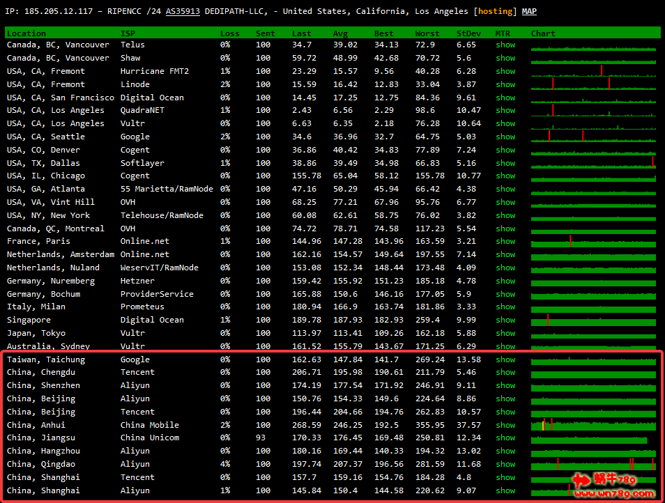 3、DediPath美国G口无限流量VPS国内节点速度测试。空闲时间表现如下,国内联通相对好一点,移动电信较为一般了。不太适合国内用户直连使用。