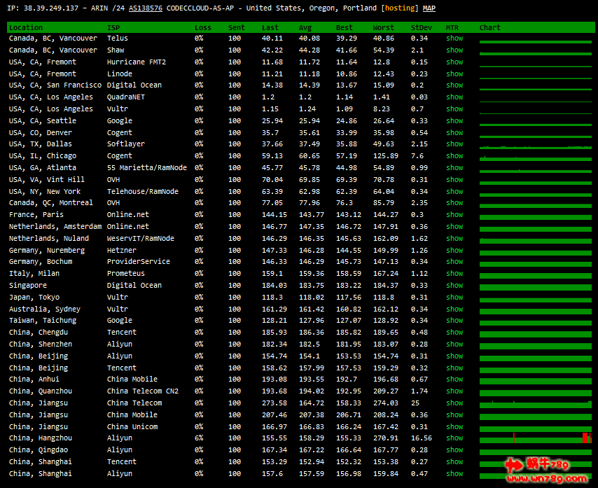 ---------------------------------------------------------------------- 北京电信 traceroute to 220.181.22.1 (220.181.22.1), 30 hops max, 60 byte packets 1 38.39.249.1 0.81 ms AS138576 美国 加利福尼亚州 洛杉矶 cogentco.com 2 218.30.49.157 1.21 ms AS4134 美国 电信 3 59.43.189.37 126.64 ms * 中国 上海 电信 4 59.43.247.141 168.83 ms * 中国 北京 电信 5 59.43.188.77 151.03 ms * 中国 北京 电信 6 59.43.132.17 149.31 ms * 中国 北京 电信 7 bj141-152-146.bjtelecom.net (219.141.152.146) 148.77 ms AS4847 中国 北京 电信 8 * 9 * 10 220.181.22.1 190.38 ms AS23724 中国 北京 电信 ---------------------------------------------------------------------- 北京移动 traceroute to 221.130.33.1 (221.130.33.1), 30 hops max, 60 byte packets 1 38.39.249.1 1.19 ms AS138576 美国 加利福尼亚州 洛杉矶 cogentco.com 2 218.30.48.245 0.62 ms AS4134 美国 加利福尼亚州 洛杉矶 电信 3 59.43.189.37 126.60 ms * 中国 上海 电信 4 59.43.247.141 150.89 ms * 中国 北京 电信 5 59.43.188.93 150.88 ms * 中国 北京 电信 6 59.43.132.25 151.94 ms * 中国 北京 电信 7 202.97.86.34 147.83 ms AS4134 中国 重庆 电信 8 * 9 221.183.65.225 169.67 ms AS9808 中国 移动 10 221.183.9.197 169.92 ms AS9808 中国 北京 移动 11 221.183.26.26 171.23 ms AS9808 中国 北京 移动 12 * 13 221.179.159.238 170.77 ms AS56048 中国 北京 移动 14 221.130.33.1 171.02 ms AS56048 中国 北京 移动 ---------------------------------------------------------------------- 杭州电信 traceroute to 60.176.0.1 (60.176.0.1), 30 hops max, 60 byte packets 1 38.39.249.1 1.50 ms AS138576 美国 加利福尼亚州 洛杉矶 cogentco.com 2 218.30.49.157 0.60 ms AS4134 美国 电信 3 59.43.186.217 8.25 ms * 美国 加利福尼亚州 圣何塞 电信 4 59.43.182.85 152.94 ms * 美国 加利福尼亚州 洛杉矶 电信 5 59.43.182.233 154.24 ms * 中国 电信 6 59.43.188.89 158.41 ms * 中国 北京 电信 7 59.43.132.33 155.72 ms * 中国 北京 电信 8 59.43.47.74 175.51 ms * 中国 电信 9 * 10 1.0.176.60.broad.hz.zj.dynamic.163data.com.cn (60.176.0.1) 160.97 ms AS4134 中国 浙江 杭州 电信 ---------------------------------------------------------------------- 宁波联通 traceroute to 60.12.17.1 (60.12.17.1), 30 hops max, 60 byte packets 1 38.39.249.1 0.94 ms AS138576 美国 加利福尼亚州 洛杉矶 cogentco.com 2 218.30.49.157 0.70 ms AS4134 美国 电信 3 59.43.186.217 8.33 ms * 美国 加利福尼亚州 圣何塞 电信 4 59.43.182.182 125.76 ms * 中国 上海 电信 5 59.43.247.141 150.04 ms * 中国 北京 电信 6 59.43.188.73 151.57 ms * 中国 北京 电信 7 59.43.132.9 149.92 ms * 中国 北京 电信 8 59.43.144.101 149.40 ms * 中国 北京 电信 9 219.158.40.165 146.78 ms AS4837 中国 北京 联通 10 219.158.5.129 154.26 ms AS4837 中国 北京 联通 11 219.158.107.198 156.59 ms AS4837 中国 浙江 杭州 联通 12 221.12.35.118 160.22 ms AS4837 中国 浙江 宁波 联通 13 221.12.33.37 154.83 ms AS4837 中国 浙江 宁波 联通 14 60.12.17.1 153.96 ms AS4837 中国 浙江 宁波 联通 ---------------------------------------------------------------------- 杭州移动 traceroute to 211.140.0.2 (211.140.0.2), 30 hops max, 60 byte packets 1 38.39.249.1 0.78 ms AS138576 美国 加利福尼亚州 洛杉矶 cogentco.com 2 218.30.48.245 0.58 ms AS4134 美国 加利福尼亚州 洛杉矶 电信 3 59.43.184.117 144.31 ms * 中国 电信 4 59.43.182.249 166.52 ms * 中国 电信 5 59.43.188.73 167.03 ms * 中国 北京 电信 6 59.43.132.9 161.93 ms * 中国 北京 电信 7 202.97.12.177 162.80 ms AS4134 中国 北京 电信 8 202.97.67.22 185.09 ms * 中国 湖北 武汉 电信 9 * 10 221.183.30.89 201.20 ms AS9808 中国 湖北 武汉 移动 11 221.183.25.17 203.75 ms AS9808 中国 湖北 武汉 移动 12 221.176.21.242 211.82 ms AS9808 中国 浙江 杭州 移动 13 211.140.0.2 214.65 ms AS56041 中国 浙江 杭州 移动 ---------------------------------------------------------------------- 贵阳电信 traceroute to 58.42.224.1 (58.42.224.1), 30 hops max, 60 byte packets 1 38.39.249.1 4.38 ms AS138576 美国 加利福尼亚州 洛杉矶 cogentco.com 2 218.30.49.157 0.76 ms AS4134 美国 电信 3 59.43.182.106 152.43 ms * 中国 广东 广州 电信 4 59.43.182.249 173.55 ms * 中国 电信 5 59.43.188.93 173.55 ms * 中国 北京 电信 6 59.43.132.21 172.62 ms * 中国 北京 电信 7 59.43.46.86 172.35 ms * 中国 上海 电信 8 59.43.145.226 210.60 ms * 中国 贵州 电信 9 * 10 59.51.187.141 213.84 ms AS4134 中国 贵州 贵阳 电信 11 58.42.224.1 212.26 ms AS4134 中国 贵州 贵阳 电信 ---------------------------------------------------------------------- 贵阳联通 traceroute to 58.16.28.1 (58.16.28.1), 30 hops max, 60 byte packets 1 38.39.249.1 0.79 ms AS138576 美国 加利福尼亚州 洛杉矶 cogentco.com 2 218.30.48.245 12.80 ms AS4134 美国 加利福尼亚州 洛杉矶 电信 3 59.43.182.106 152.28 ms * 中国 广东 广州 电信 4 59.43.247.97 201.52 ms * 中国 北京 电信 5 * 6 59.43.132.9 168.36 ms * 中国 北京 电信 7 59.43.46.82 173.18 ms * 中国 上海 电信 8 219.158.40.173 172.17 ms AS4837 中国 上海 联通 9 219.158.9.97 171.68 ms AS4837 中国 上海 联通 10 219.158.17.134 205.98 ms AS4837 中国 贵州 贵阳 联通 11 58.16.252.106 226.65 ms AS4837 中国 贵州 贵阳 联通 12 211.92.136.221 208.89 ms AS4837 中国 贵州 贵阳 联通 13 58.16.28.1 207.96 ms AS4837 中国 贵州 贵阳 联通 ---------------------------------------------------------------------- 贵阳移动 traceroute to 211.139.0.10 (211.139.0.10), 30 hops max, 60 byte packets 1 38.39.249.1 0.92 ms AS138576 美国 加利福尼亚州 洛杉矶 cogentco.com 2 218.30.48.245 0.57 ms AS4134 美国 加利福尼亚州 洛杉矶 电信 3 59.43.184.117 144.33 ms * 中国 电信 4 59.43.182.249 165.47 ms * 中国 电信 5 59.43.188.93 165.56 ms * 中国 北京 电信 6 59.43.132.21 166.58 ms * 中国 北京 