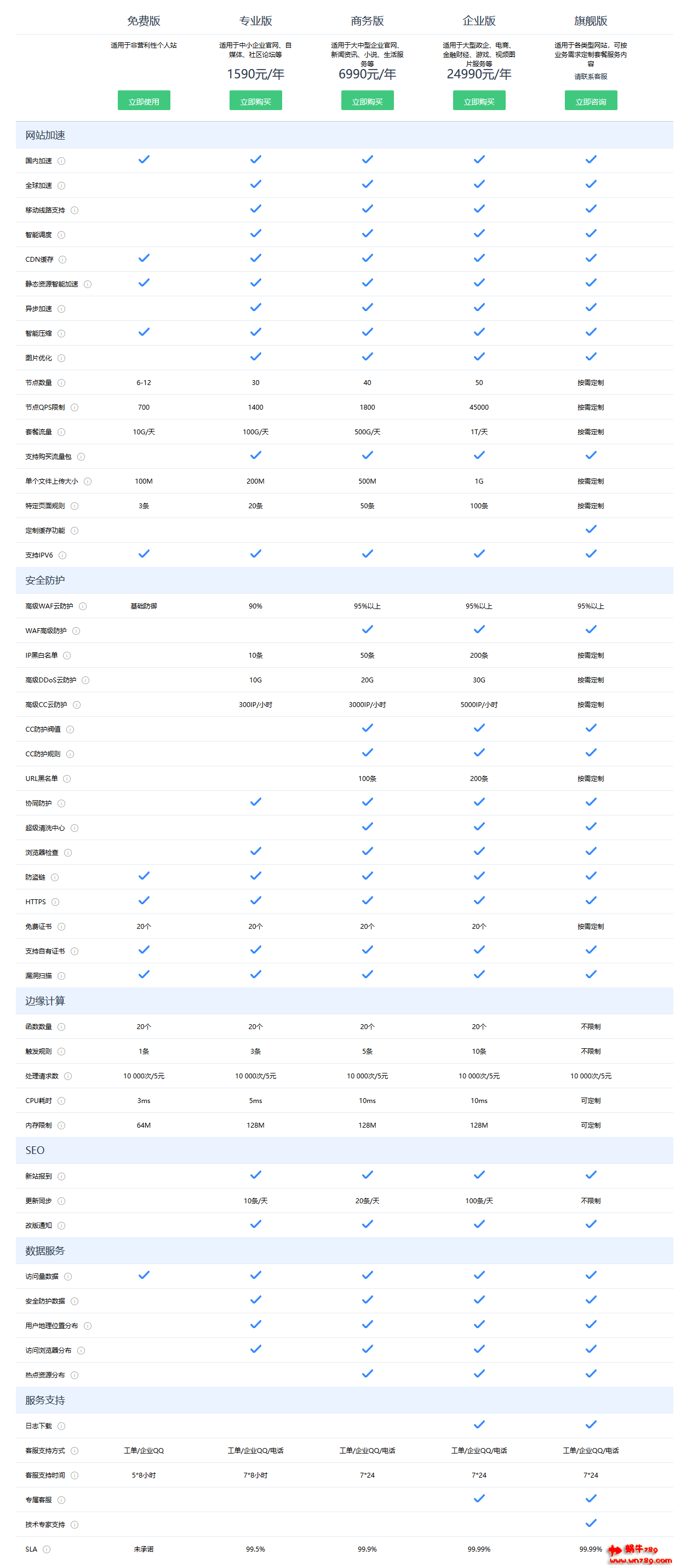 百度云加速目前分为免费版、专业版、商务版、企业版旗舰版几个版本,要求必须有备案号的域名才能使用,免费版仅能实现基础功能,提供少量的国内几点加速服务和攻击防护功能,不提供SEO优化相关服务!所以一般建议个人博客和企业站点使用百度云加速的专业版!百度云加速免费版、专业版、商务版、企业版旗舰版几个版本功能介绍如下!