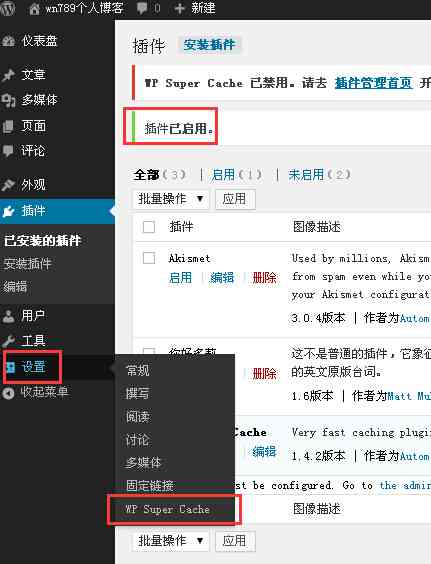 1.先下载“WP Super Cache”缓存插件,并安装: