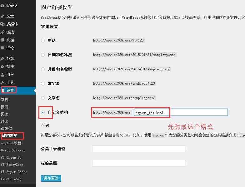 2.点击插件之后是不是提示错误呀,说“WP Super Cache 已禁用”。没事,那是因为我们没有设定股东链接设置,我们先点击“设置”,然后选择“固定链接选项”,再按下图选择“自定义结构”,然后在后面填写“/%post_id%.html”(意思是已文章ID号形式的html格式来访问页面,如:? https://www.zhuji999.com/5.html)然后在点击“保存更改”。这样就可以正常使用WP Super Cache了。