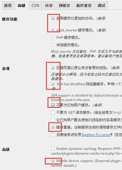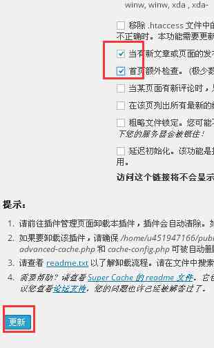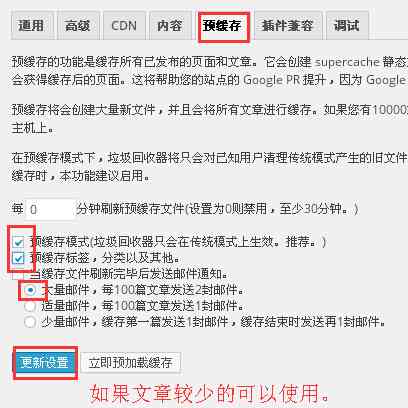 8.预缓存,是把你整个站点都生产.html静态文件,如果你文章比较少的话建议开启。它有利于搜索引擎抓取。,选择好后,点击“更新设置”,然后再点击“立即预加载缓存”就会开始自动生成全站静态文件。