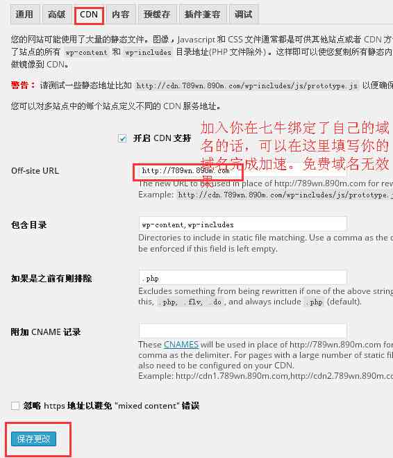 6.CDN加速,这里如果你使用了zhuji999介绍的“如何利用【七牛云储存】免费搭建WordPress站图片及JS、css文件CDN加速”,并且绑定了自己的域名,可以在这里开启,并填写你的域名,如果是使用七牛提供的免费域名则无效。