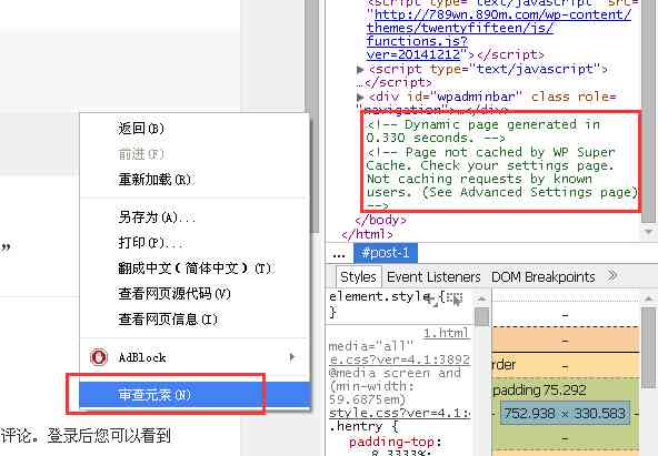 9.最后我们来验证是否加速成功。如果你使用了谷歌浏览器,打开你的网站主页或任意页面,点击右键,选择“审查元素”,然后你在一串代码内,看能否看到如下图红框位置的代码,如果有表示已经缓存成功咯。