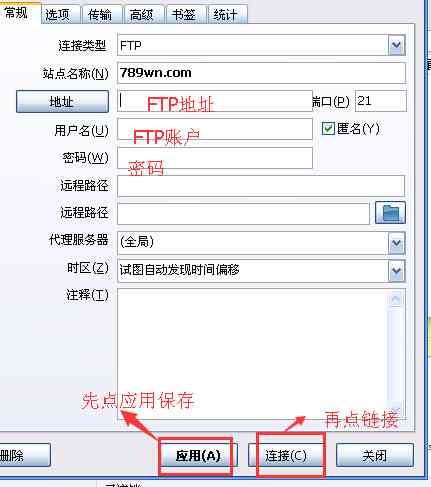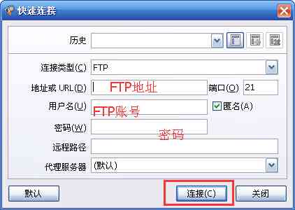 2.点击“快速连接”后,会弹出下面窗口,这时你需要填写你FTP信息,FTP信息哪里来?都是在你主机或空间商提供的。