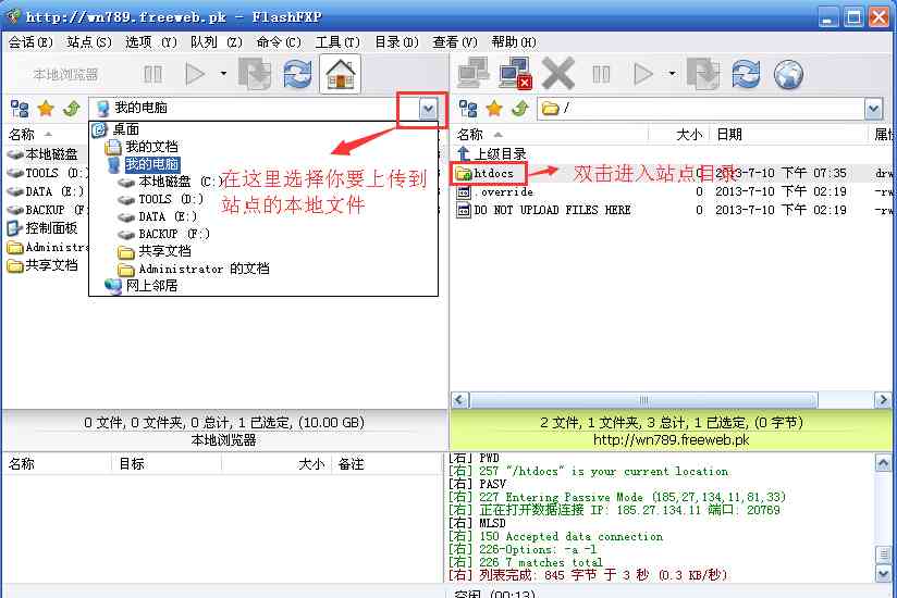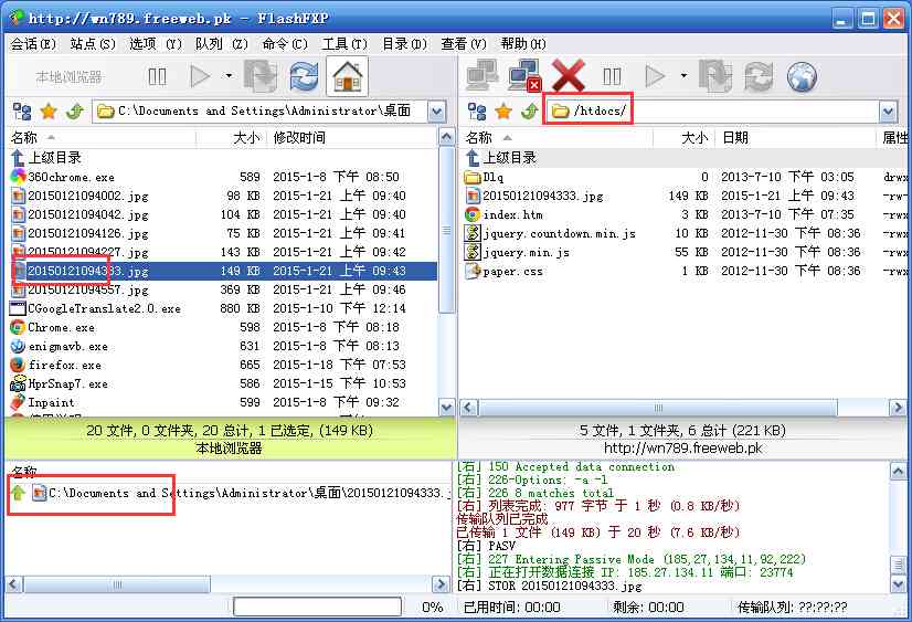 4.文件上传和下载。软件界面右侧一般是服务器主机链接窗口,左侧是你本地窗口,我们先在右侧窗口找到你站点内容存放的文件夹,到底是哪个文件夹,一般主机商会提醒或告诉你,还有一般基本都是这些文件夹“www”“htdocs”“public_html”当然,也有例外的,所有实在搞不清楚就问你的主机商吧。右侧进入到站点文件目录后,我们再在左侧窗口找到你要上传的文件。