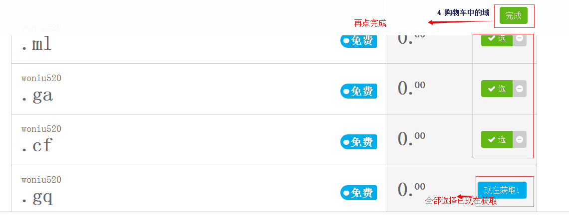 2、如果你填写的域名可以注册,会显示如下页面,我们根据自己的需要选择“现在获取”,也可以把可以注册的域名全部选择好,然后点击上面的”完成按钮“